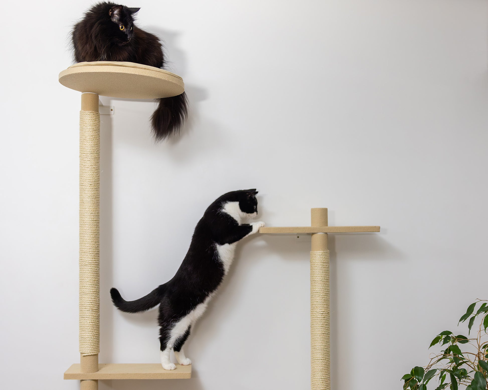 Suosittelemme myös tilaamaan tolpan yläpäähän tolpan päätypalan, joka viimeistelee tolpan ilmeen ja mahdollistaa kissan vetoliikkeen kiivetessä tolpan päällä olevalle tasolle. Mikäli rakennat itse kiipeämistolpan kahdesta peräkkäisestä kiipeilytolpasta, riittää niiden keskikohtaan yksi kiinnike. Kiinnikkeen yhteyteen voi asettaa lisäksi myös askelma- tai lepotason.